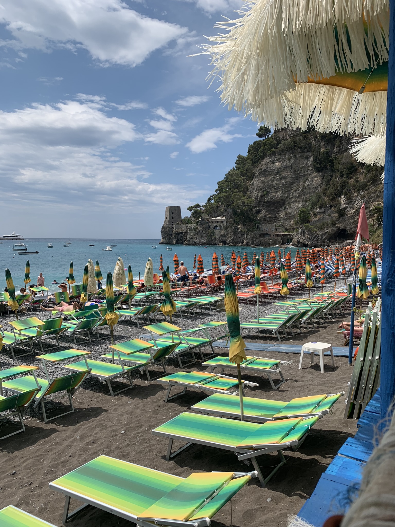 - Plan to rent beach chairs and umbrellas for the day, for 30 Euro on average. You do not need to do this in advance, but make sure to arrive by around 10 am for a prime seaside spot. Although there is a free public beach space, it’s narrow and crowded. Since the beach is rocky, you will want to rent chairs as opposed to laying out on a towel or blanket.