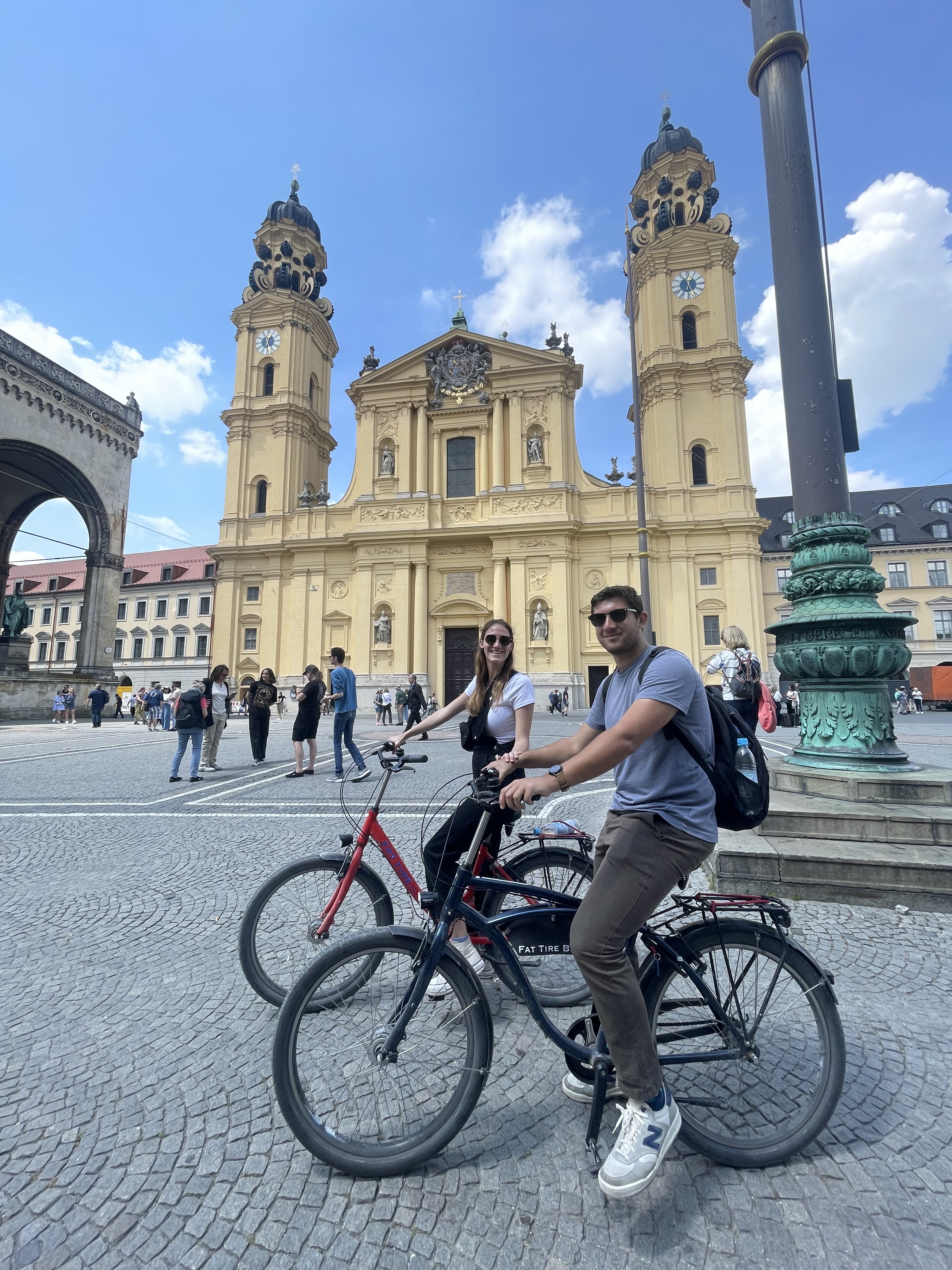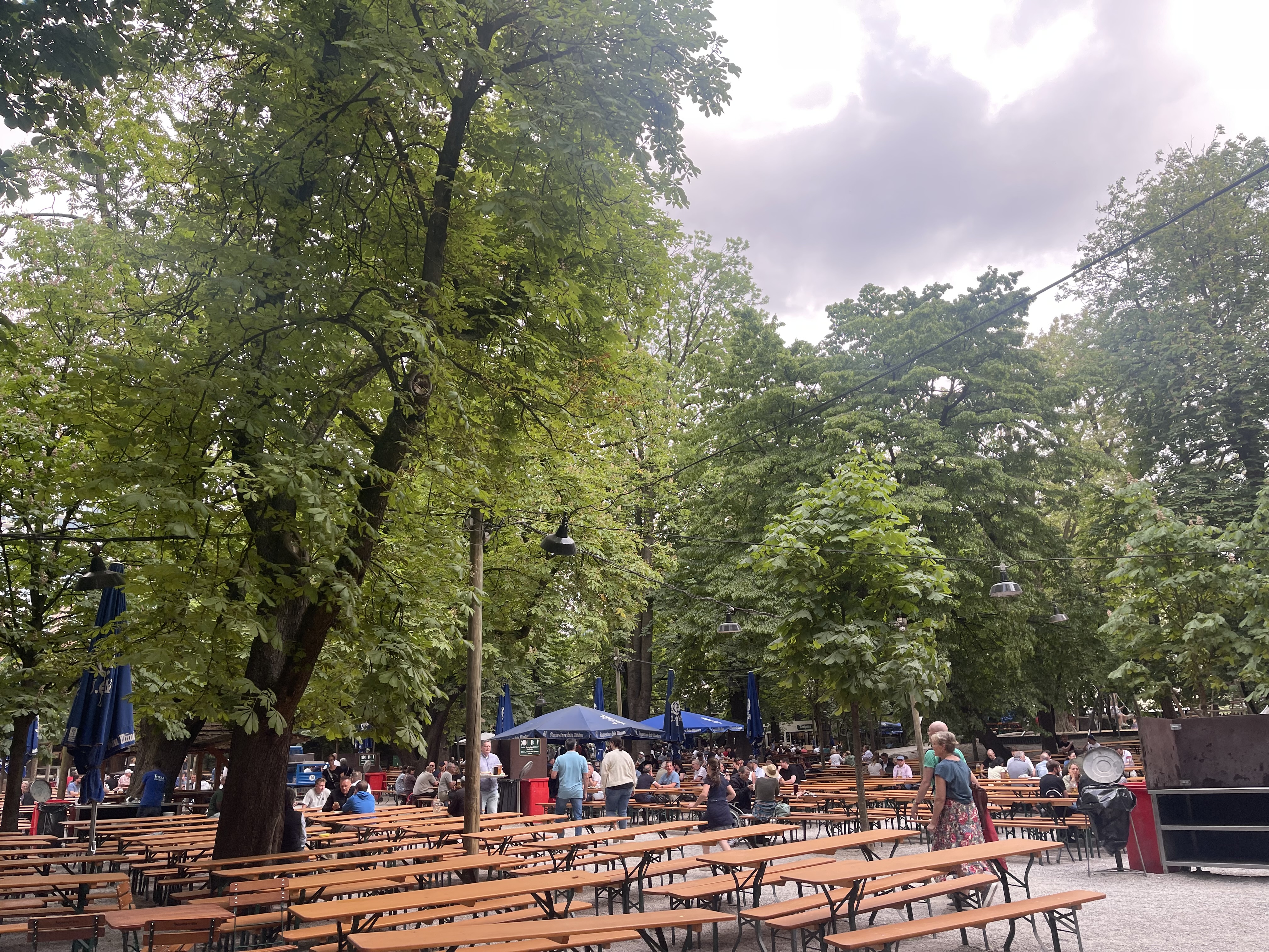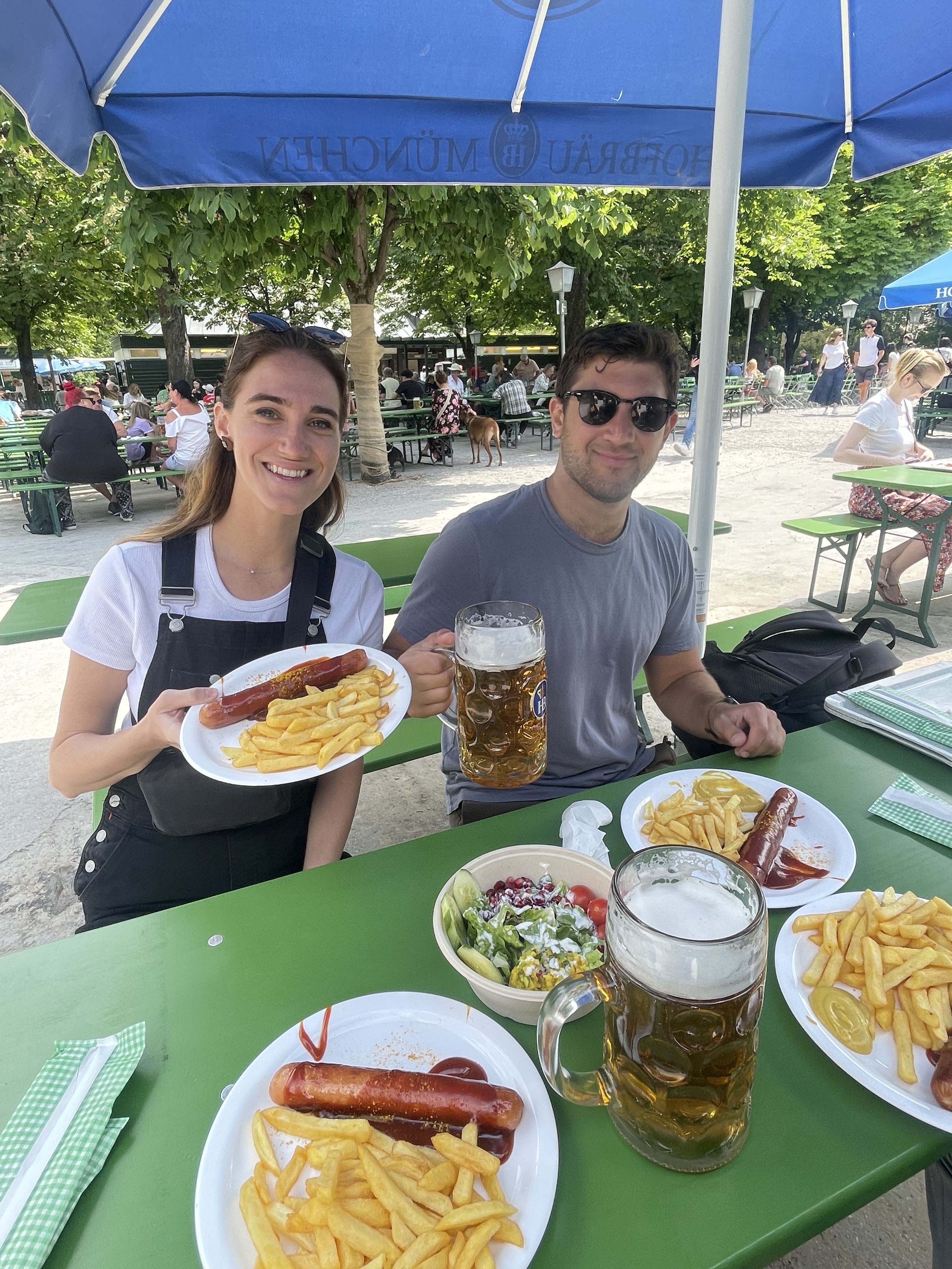 No better way to see this expansive city than by a low-impact bike tour, especially when hosted by Fat Tire. Their tour guides are passionate, informative, approachable, and someone you feel you could have a beer with – and you will, at the beer garden for lunch! There is minimal riding time on any of the busy roads, with the majority of the time spent biking through beautiful green parks, along the rivers, or the sidewalks near main sites. Fat Tire offers different iterations of tours around Munich, such as those focused around drinking and food, but we enjoyed the classic daytime City Bike Tour, which stopped at all the major sites, squares, and parks. One of the highlights was stopping in a traditional German beer garden for an extended lunch of classic Bavarian currywurst, frites, and pints of beer and seeing the river wave surfers at Eisbach. After the tour, our guide recommended another classic beer garden where we went to relax and spend the rest of the afternoon (see next recommendation!).
